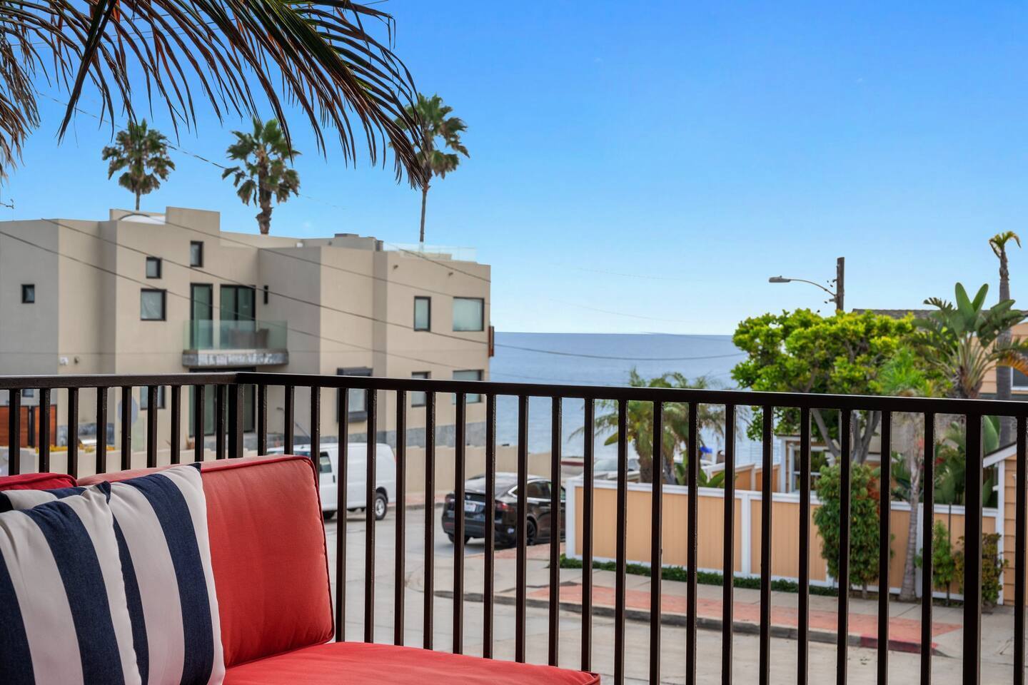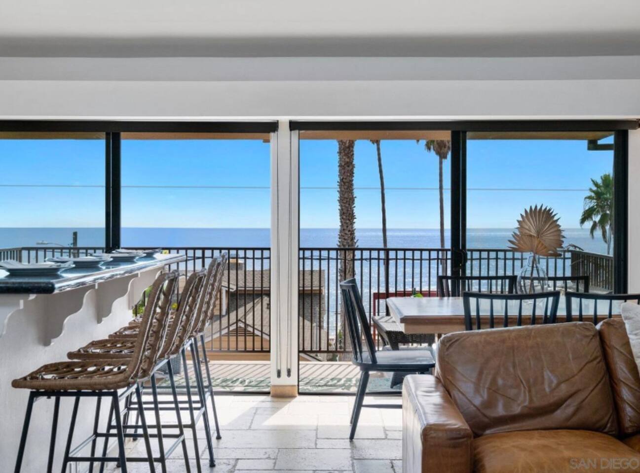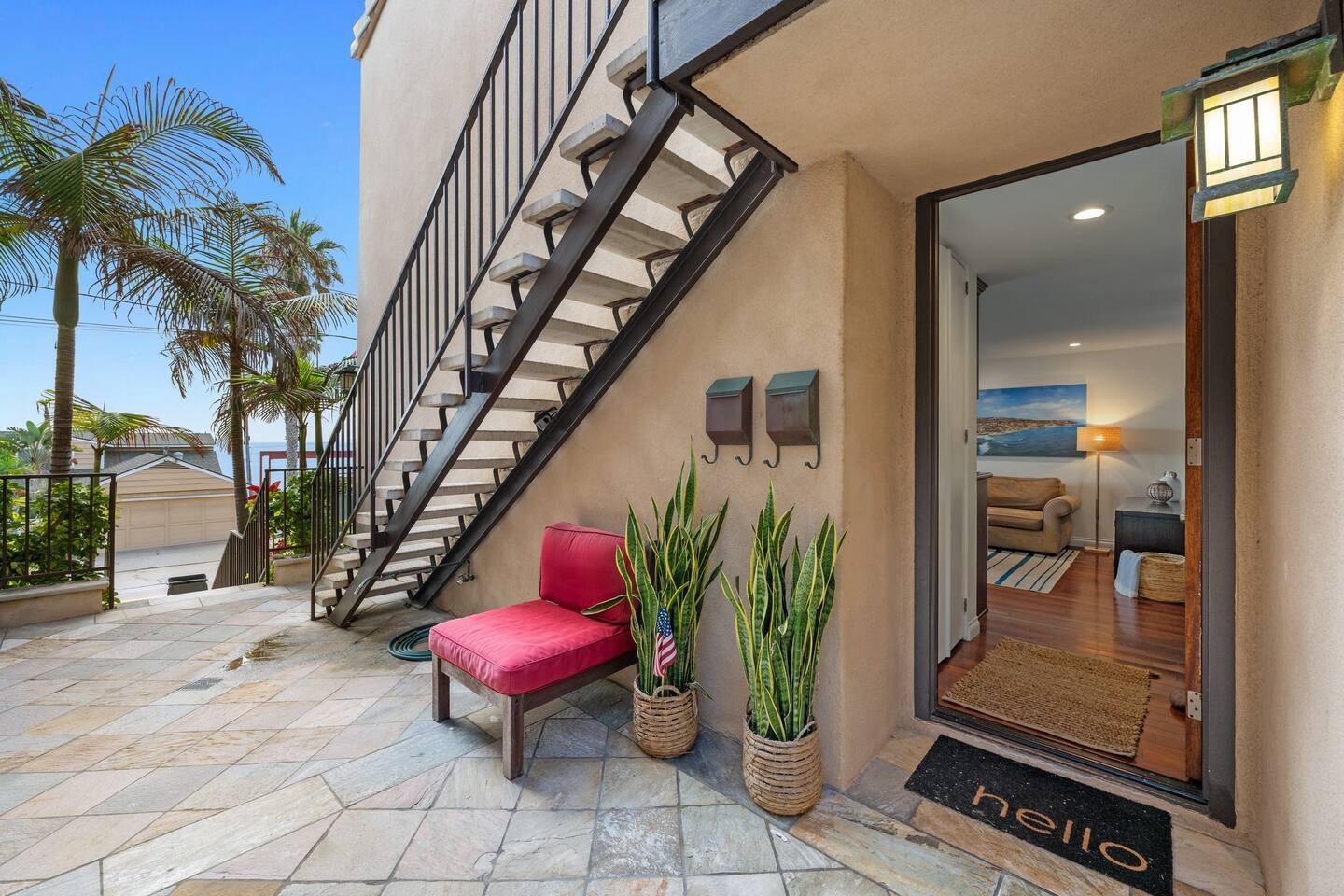 OohLala Spa features a single-level floor plan and is beautifully decorated in a beachy-chic theme that will get you in a summer state of mind. Floor-to-ceiling sliding glass doors provide a very open feeling, leading to the ocean beyond. The living area includes a cozy sectional couch and a large TV, a kitchen with stainless steel appliances, granite countertops, and a breakfast bar. Oohlala Spa features 2 suites, each with king-sized memory foam beds, and there's a roll-away for extra sleeping accommodations. Each suite also includes a private bathroom with travertine tile and modern sink consoles. Both bathrooms feature a stand–up shower. Each bedroom also opens to a private back patio. Out back is a slate patio with an outdoor bar and a built-in bubbling spa, the perfect place to relax! This home is conveniently located within a 5-minute drive to local favorite food and drink spots and the world-class restaurants and local boutiques of downtown La Jolla Village and Prospect Street. Call or message Sherri at Ooh Lala Jolla to make sure this is the perfect home for you. Once you arrive, we are here to ensure you have a 5-star experience! Ooh Lala Spa Layout • Living area • Full kitchen • Breakfast bar island, seating for 4 • Dining area with seating for 6 • Oceanview balcony with seating • Bedroom 1: King bed (sleeps 2), TV • En suite bathroom, walk-in shower • Access to a balcony with gas BBQ • Bedroom 2: King bed (sleeps 2), TV • En suite bathroom with walk-in shower PARKING • 1-car space in the driveway • Narrow, not suitable for larger vehicles • Limited additional street parking Only accessible by stairs