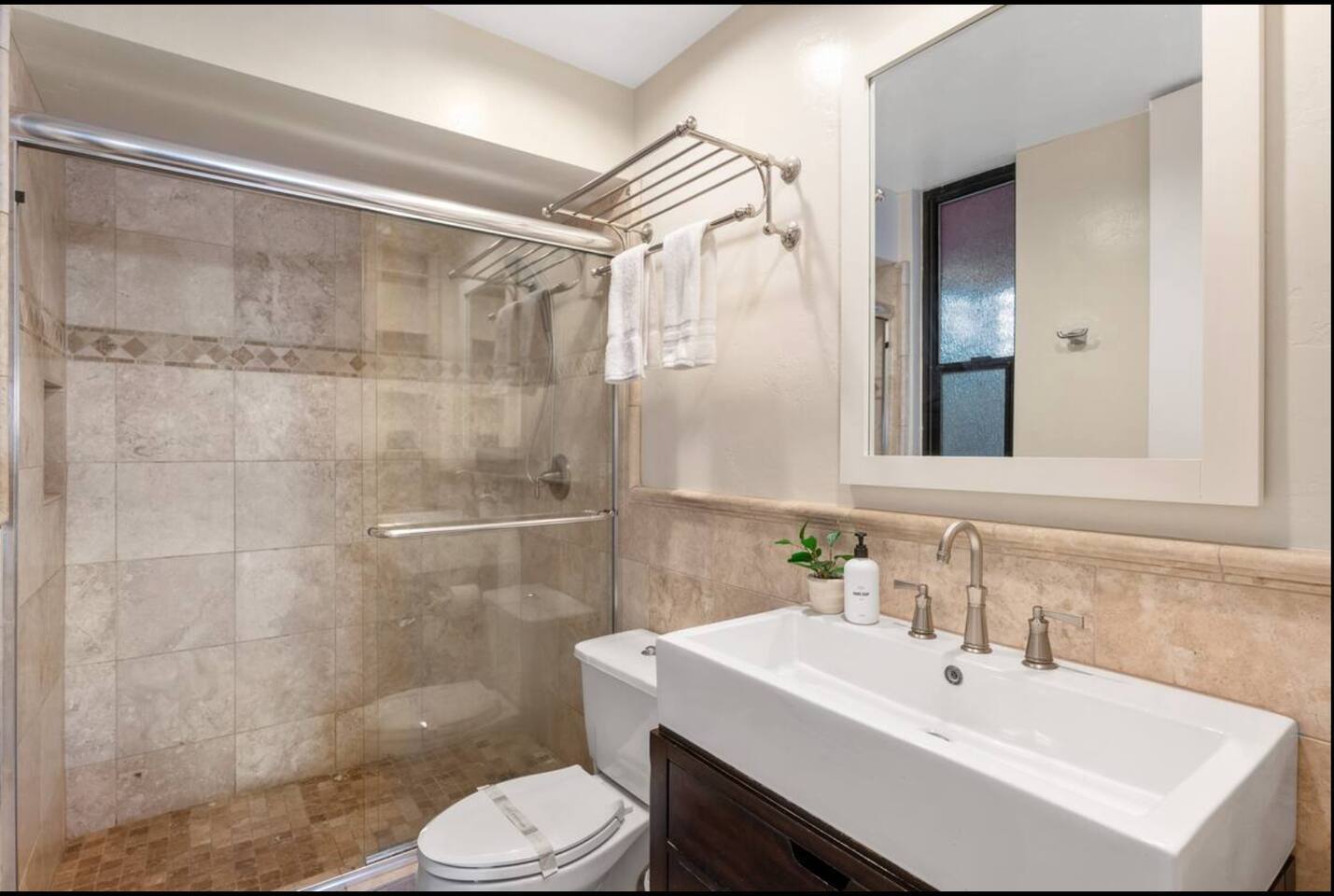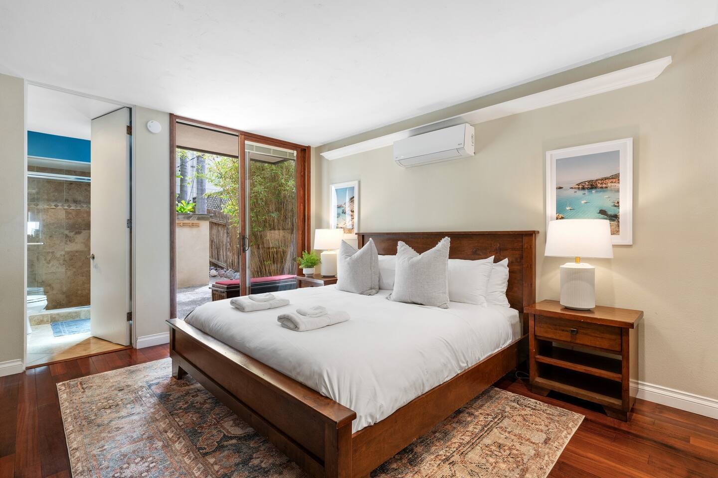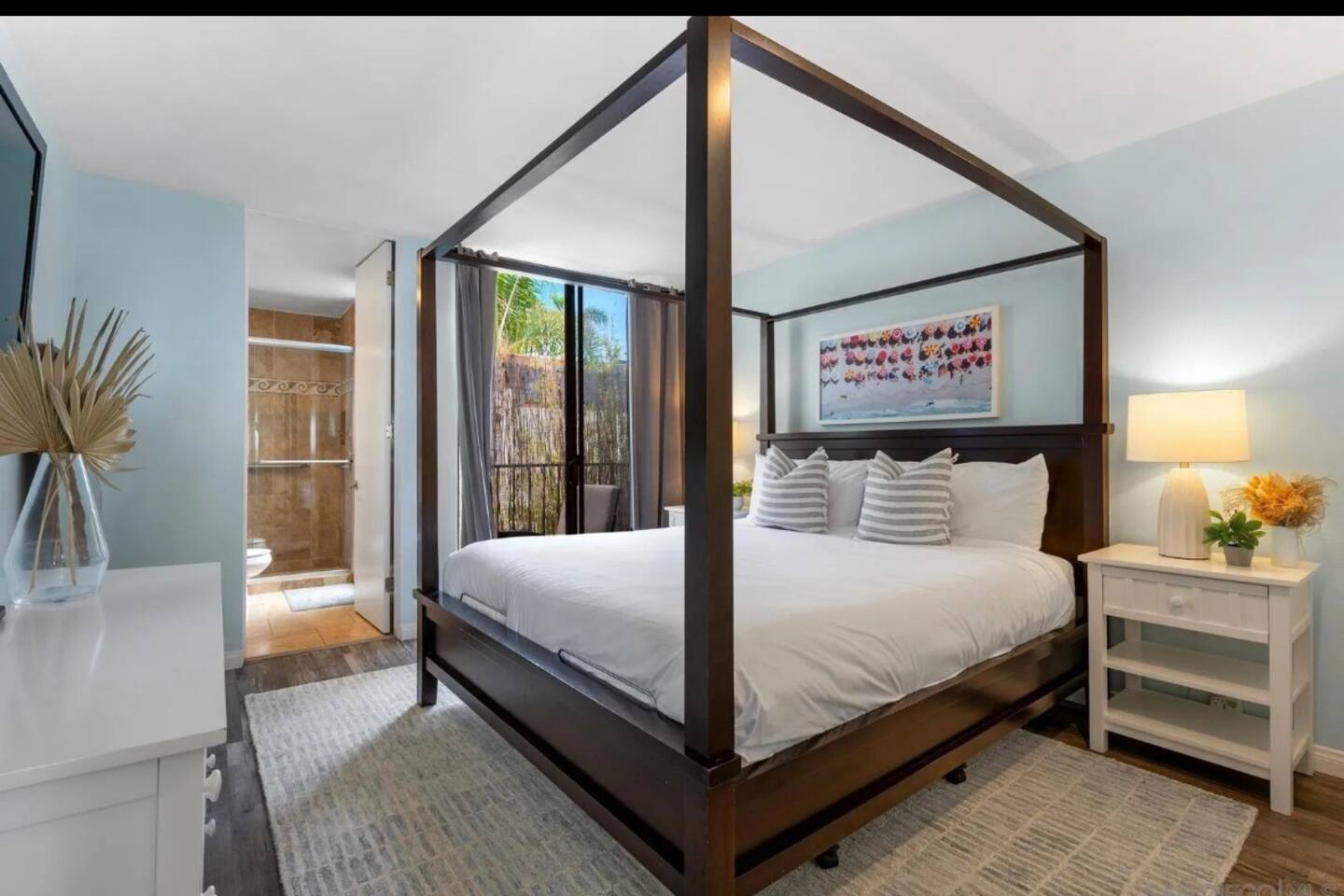 OohLala Spa features a single-level floor plan and is beautifully decorated in a beachy-chic theme that will get you in a summer state of mind. Floor-to-ceiling sliding glass doors provide a very open feeling, leading to the ocean beyond. The living area includes a cozy sectional couch and a large TV, a kitchen with stainless steel appliances, granite countertops, and a breakfast bar. Oohlala Spa features 2 suites, each with king-sized memory foam beds, and there's a roll-away for extra sleeping accommodations. Each suite also includes a private bathroom with travertine tile and modern sink consoles. Both bathrooms feature a stand–up shower. Each bedroom also opens to a private back patio. Out back is a slate patio with an outdoor bar and a built-in bubbling spa, the perfect place to relax! This home is conveniently located within a 5-minute drive to local favorite food and drink spots and the world-class restaurants and local boutiques of downtown La Jolla Village and Prospect Street. Call or message Sherri at Ooh Lala Jolla to make sure this is the perfect home for you. Once you arrive, we are here to ensure you have a 5-star experience! Ooh Lala Spa Layout • Living area • Full kitchen • Breakfast bar island, seating for 4 • Dining area with seating for 6 • Oceanview balcony with seating • Bedroom 1: King bed (sleeps 2), TV • En suite bathroom, walk-in shower • Access to a balcony with gas BBQ • Bedroom 2: King bed (sleeps 2), TV • En suite bathroom with walk-in shower PARKING • 1-car space in the driveway • Narrow, not suitable for larger vehicles • Limited additional street parking Only accessible by stairs